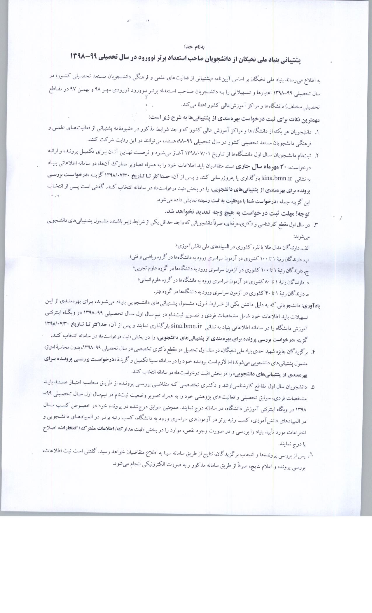 فراخوان « ثبت نام دانشجویان نوورود برای بهره مندی از تسهیلات دانشجویی بنیاد نخبگان در سال تحصیلی 99-1398»