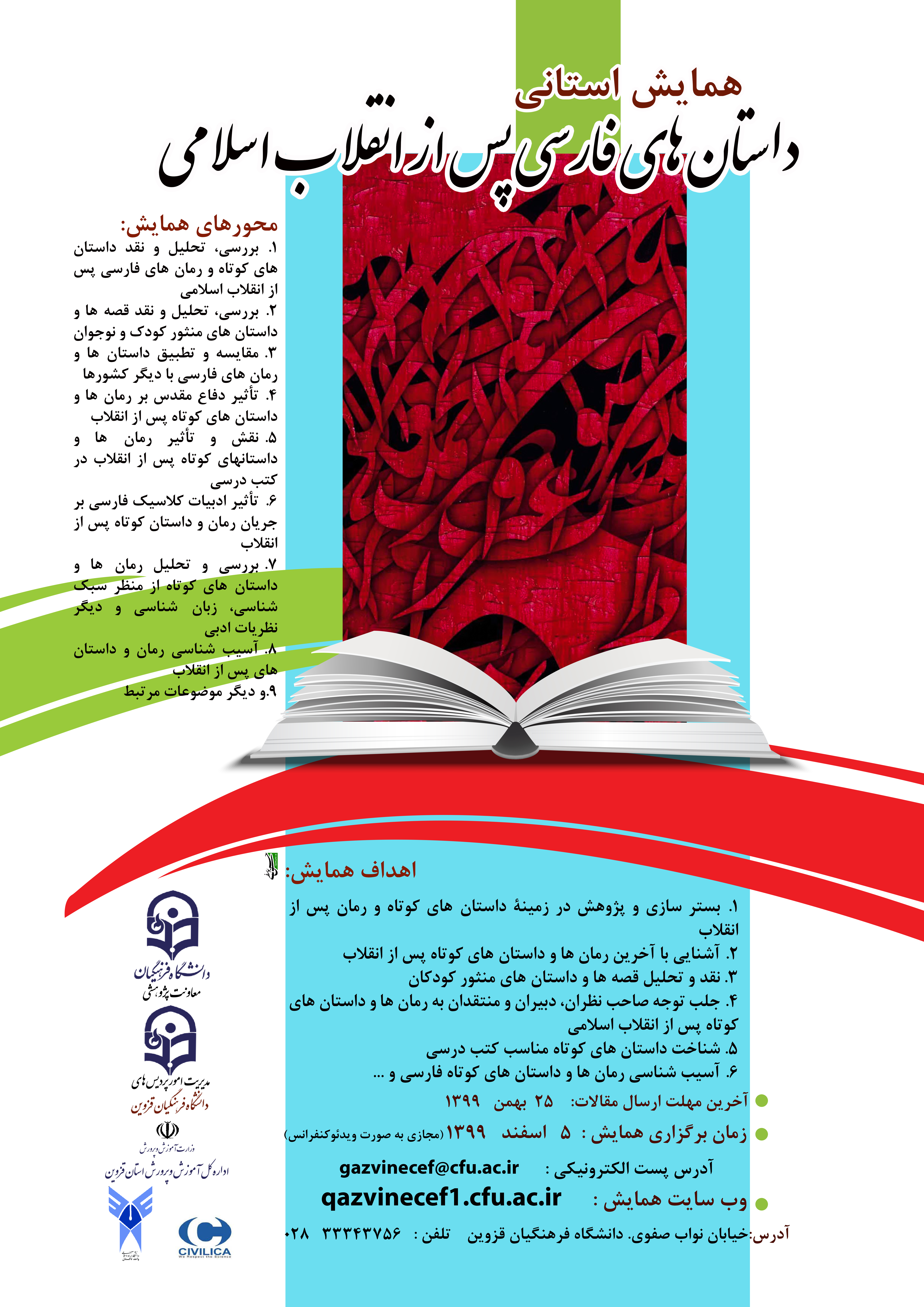 همایش استانی داستان های فارسی پس از انقلاب اسلامی در تاریخ 99/12/05 در دانشگاه فرهنگیان استان قزوین برگزار خواهد شد .