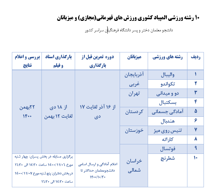 - مسابقات در 10 رشته ورزشی، مطابق دستورالعمل های فنی و اجرایی (پیوست) برای دانشجو معلمان برگزار خواهد شد و توجه به مقررات فنی در هر رشته، فرمت بارگذاری و زمان مندرج در جدول فوق تاکید می گردد.