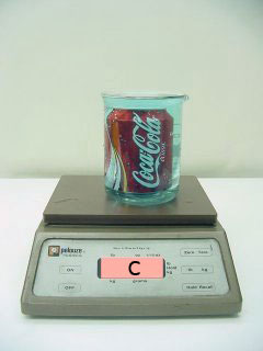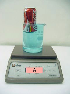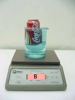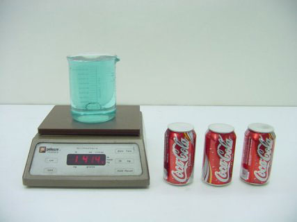 ظرفی که تا لبه آن از آب پرشده است را روی ترازوی دیجیتال قرار داده ایم عدد 1/414 کیلوگرم را نشان میدهد