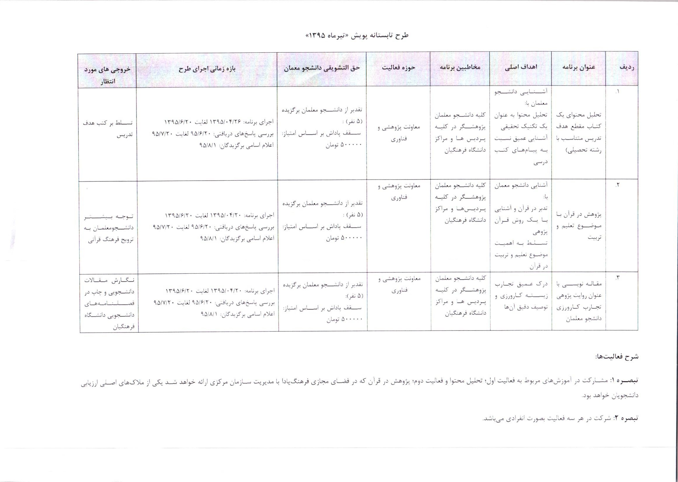 معاونت پژوهشی و فرهنگی دانشگاه فرهنگیان از کلیه دانشجو معلمان پژوهشگر دانشگاه فرهنگیان سراسر کشور دعوت می کند تا در طرح تابستانه "پویش" سال 1395 متشکل از سه فعالیت تحلیل محتوای کتاب،پژوهش در قرآن و مقاله بصورت غیر حضوری و مجازی( با استفاده از ظرفیت فرهنگیادا:باشگاه دانشجو معلمان پژوهشگر)به شرح زیر شرکت نمایند.