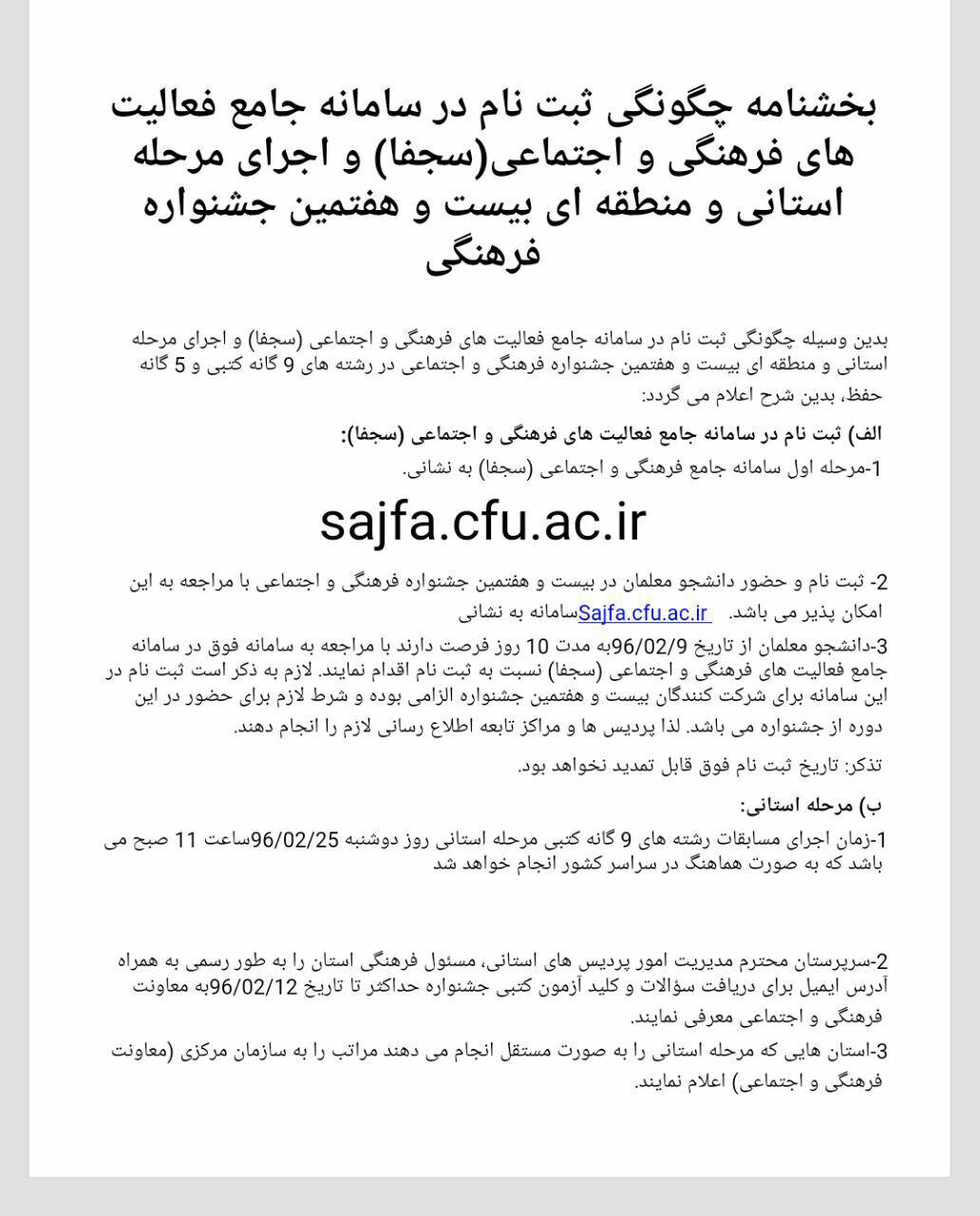 قابل توجه کلیه دانشجومعلمان بخشنامه ثبت نام در سامانه جامع فعالیت های فرهنگی و اجتماعی (سجفا ) به شرح ذیل می باشد .با توجه به اینکه مهلت ثبت نام از 9 اردیبهشت به مدت 10 روز می باشد خواهشمند است ثبت نام تمامی دانشجویان ثبت نام خود را به طور کامل انجام دهند .
