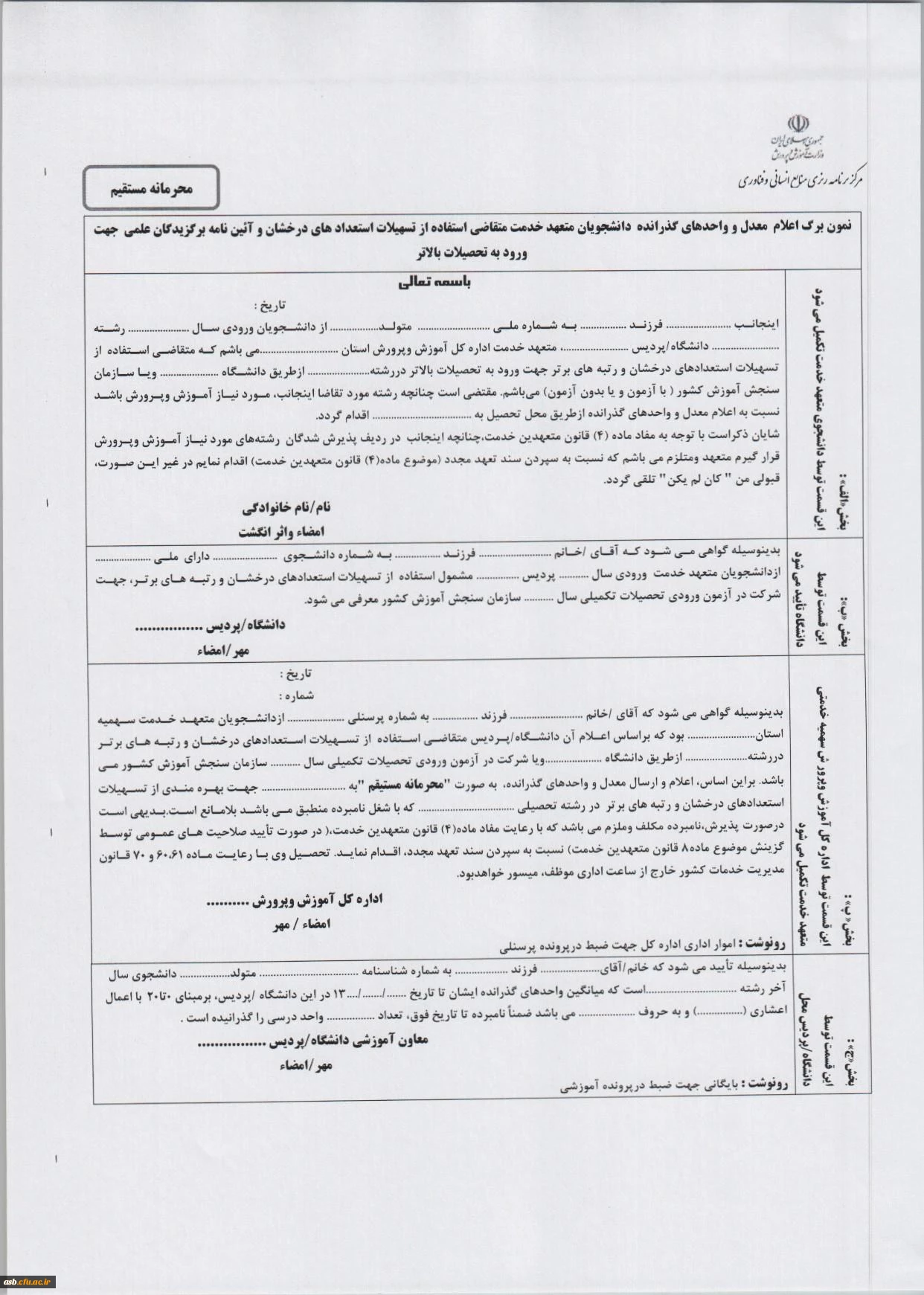 ارسال نمونه برگ اعلام معدل دانشجویان متعهد خدمت متقاضی استفاده از تسهیلات استعدادهای درخشان 2