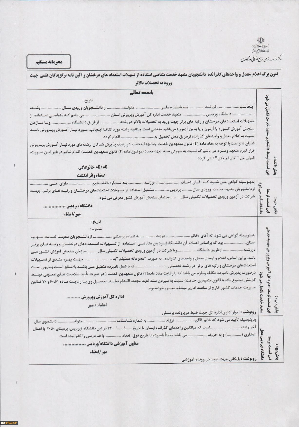 ارسال نمونه برگ اعلام معدل دانشجویان متعهد خدمت متقاضی استفاده از تسهیلات استعدادهای درخشان 2