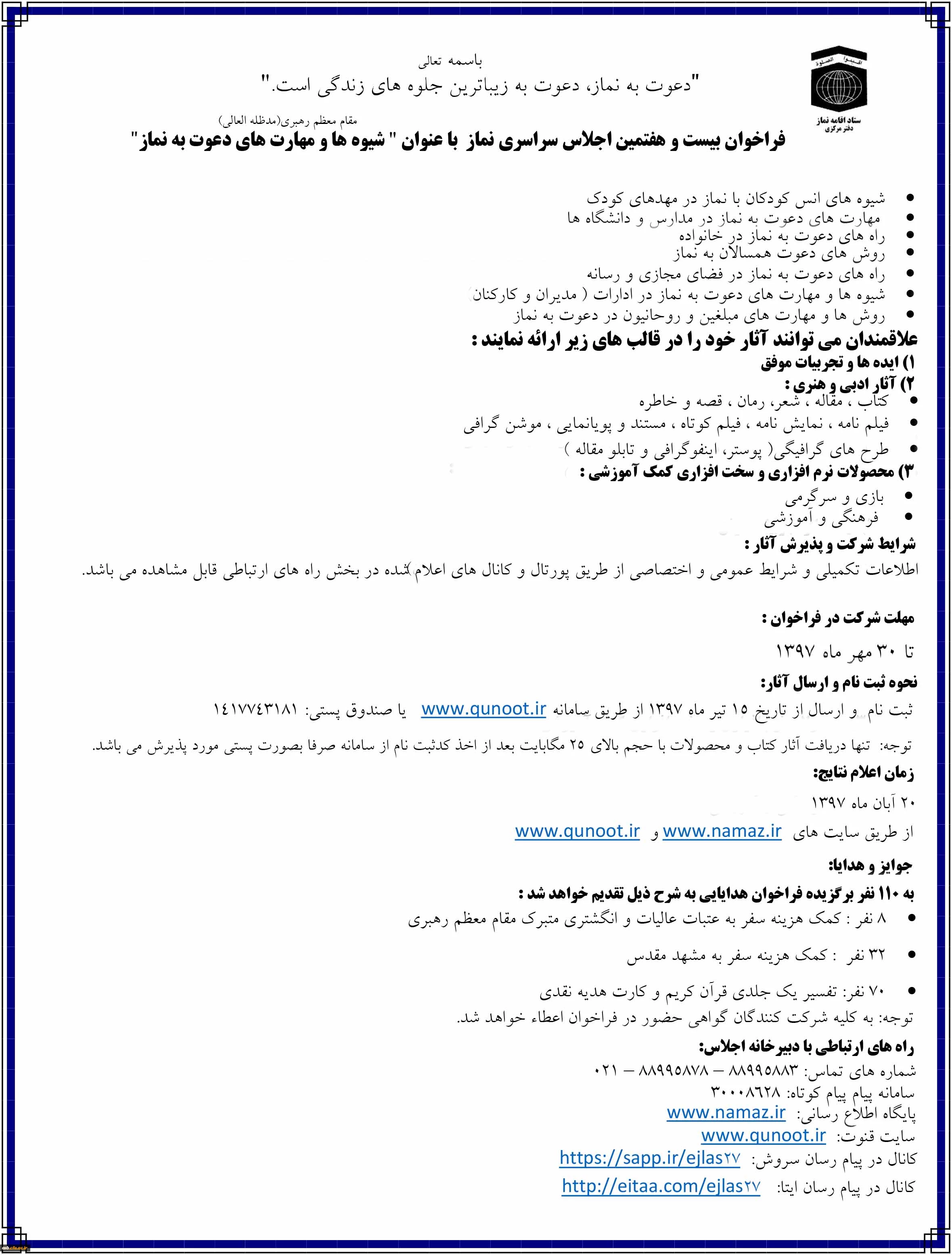 فراخوان بیست و هفتمین اجلاس سراسری نماز با عنوان " شیوه ها و مهارت های دعوت به نماز " 2