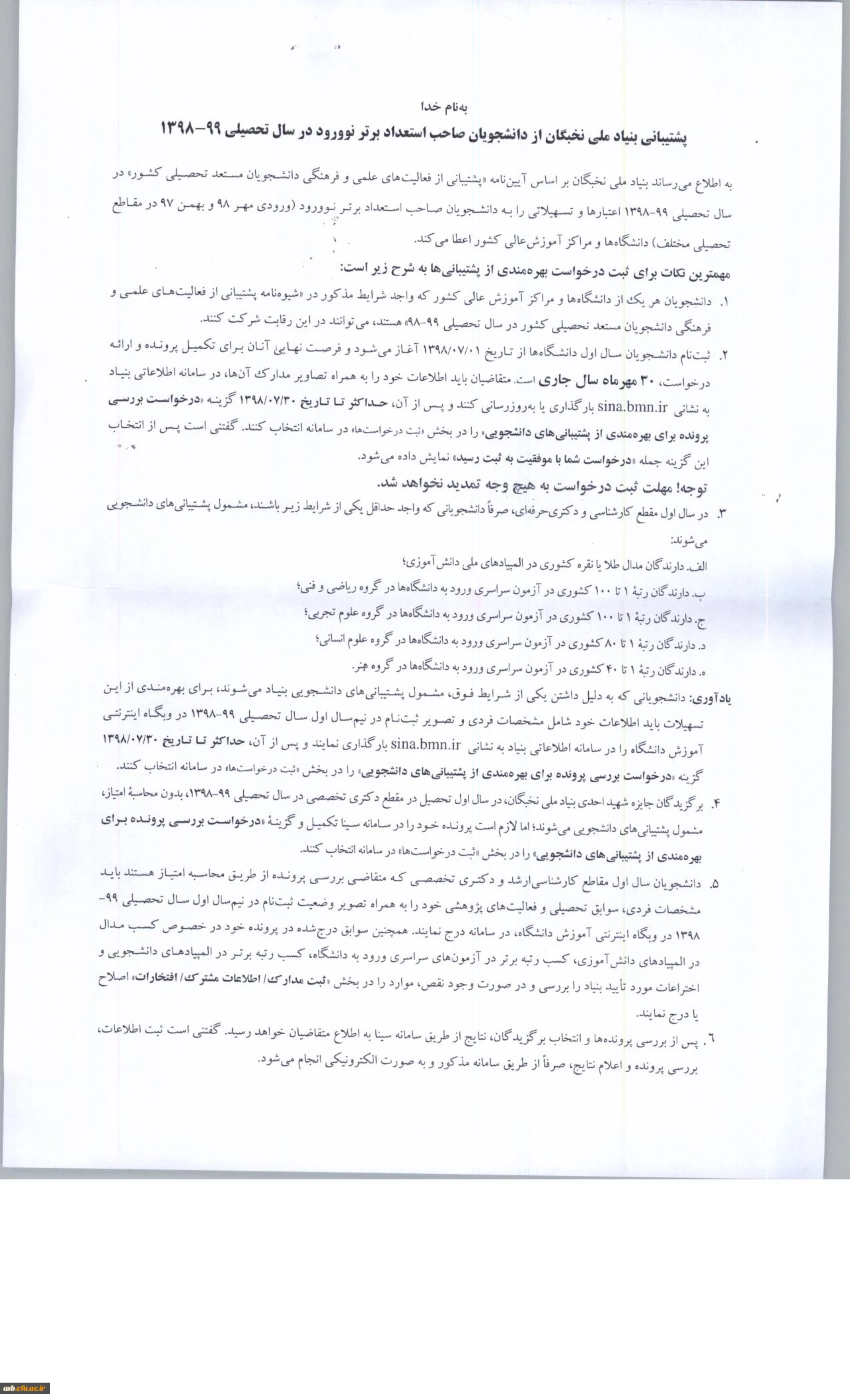 فراخوان « ثبت نام دانشجویان نوورود برای بهره مندی از تسهیلات دانشجویی بنیاد نخبگان در سال تحصیلی 99-1398» 3