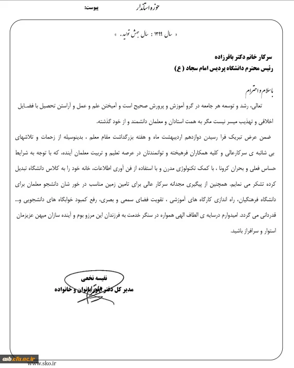 امتیاز دهید : پیام تبریک و تقدیر مدیرکل دفتر امور بانوان و خانواده استانداری از خانم دکتر باقرزاده 2 شنبه 20 اردیبهشت 1399 ساعت 11:35