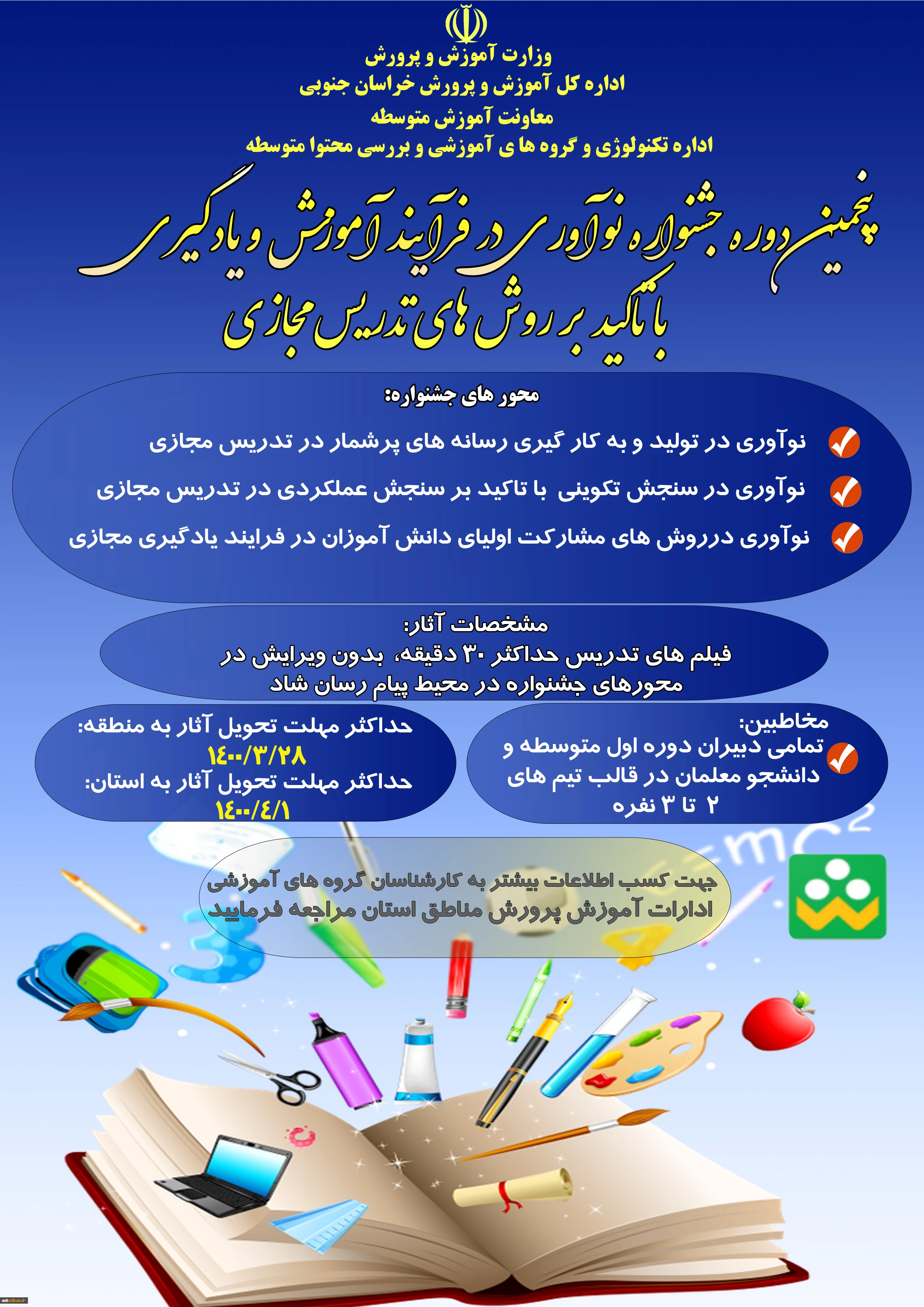 امتیاز دهید : پنجمین دوره جشنواره نوآوری در فرآیند آموزش و یادگیری با تاکید بر روش های تدریس مجازی 2 شنبه 4 اردیبهشت 1400 ساعت 7:27