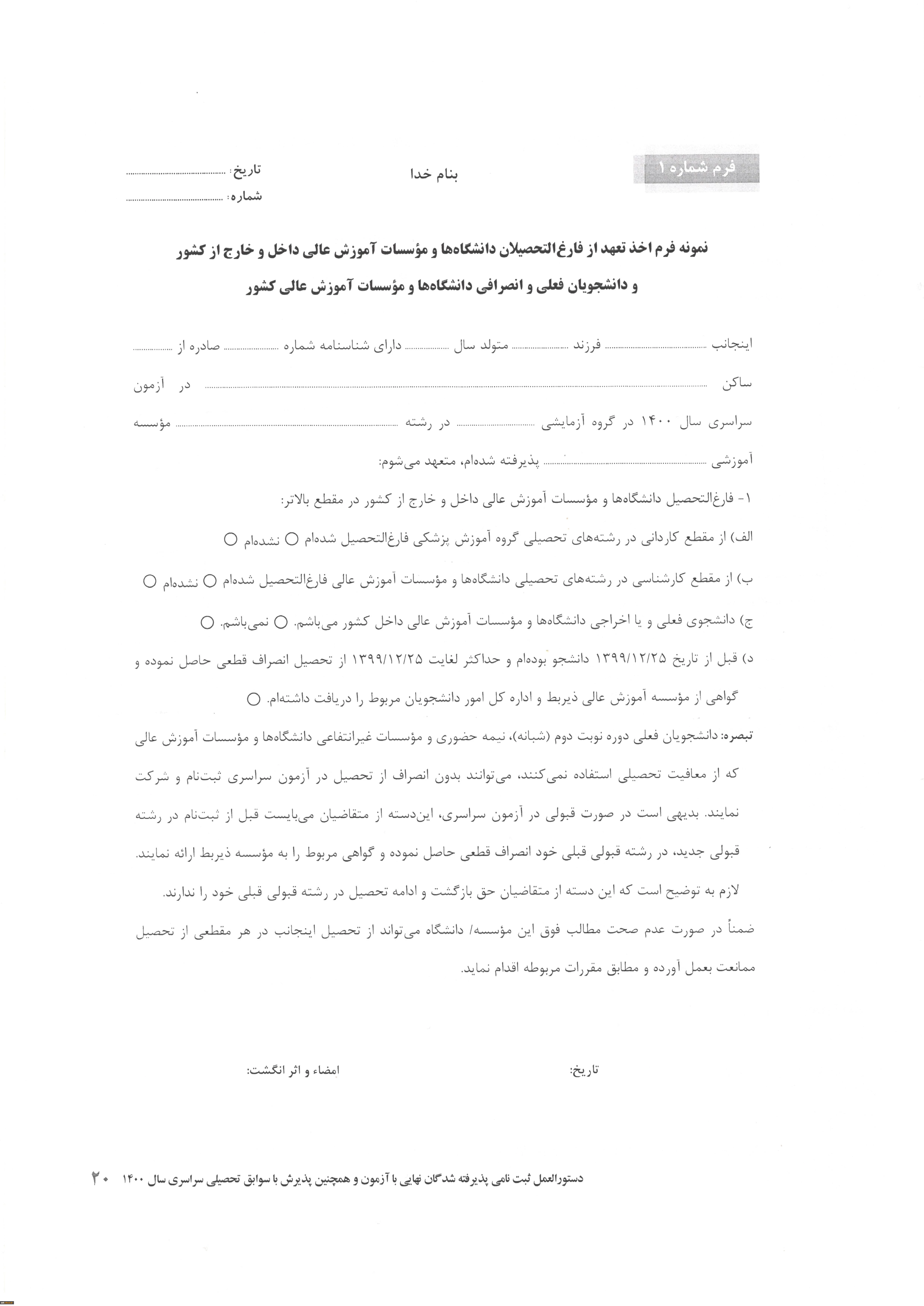 فرم شماره 1( پذیرفته شدگان کنکور 1400)