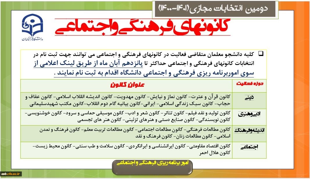 امتیاز دهید : ثبت نام کاندیداتوری شورای مرکزی کانون های فرهنگی هنری و انجمن های علمی سال 1400 4 دوشنبه 10 آبان 1400 ساعت 9:24