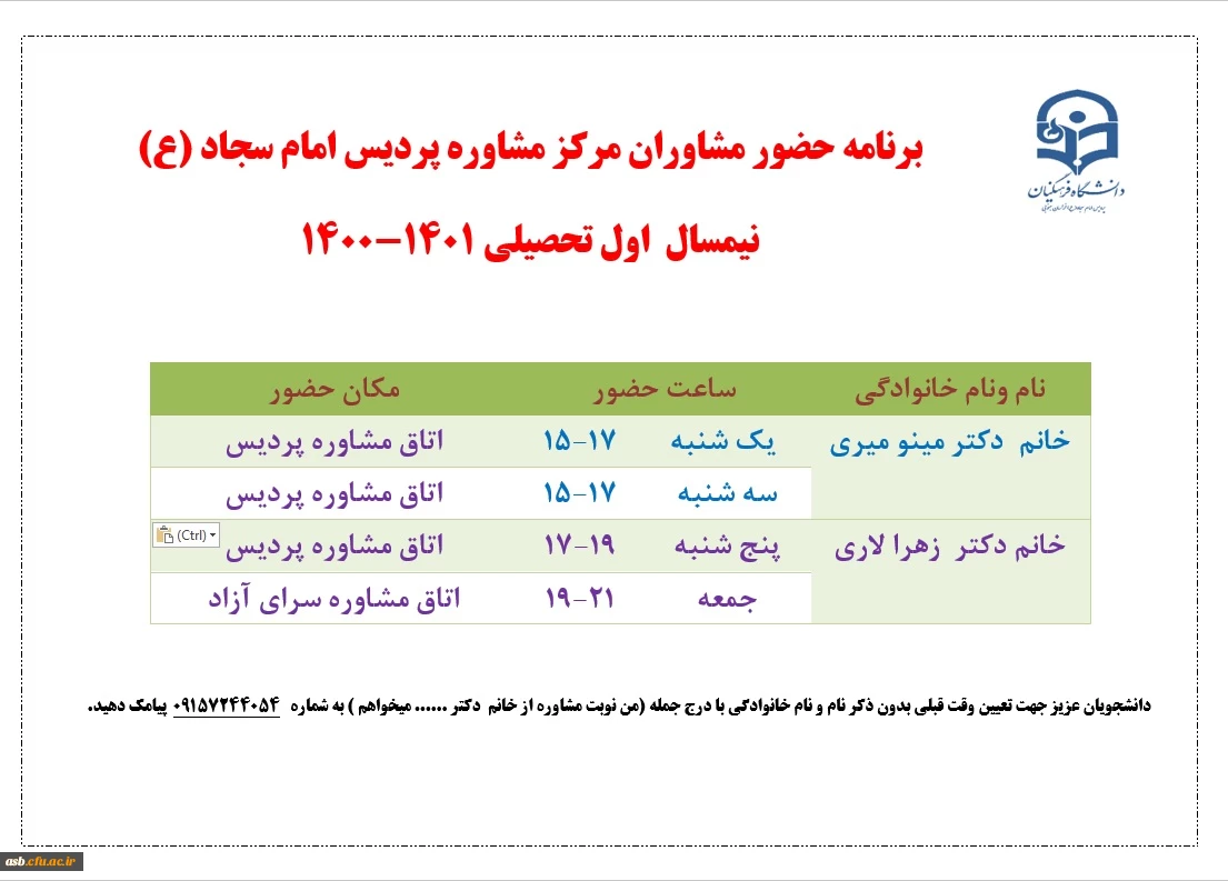 برنامه حضور مشاوران مرکز مشاوره 2