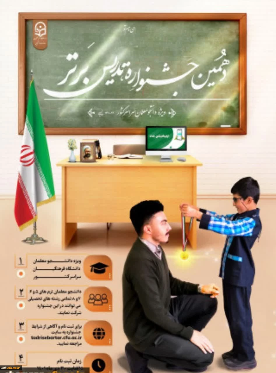 امتیاز دهید : ثبت نام دهمین جشنواره تدریس برتر ویژه دانشجومعلمان دانشگاه فرهنگیان 2 چهارشنبه 3 اسفند 1401 ساعت 17:21
