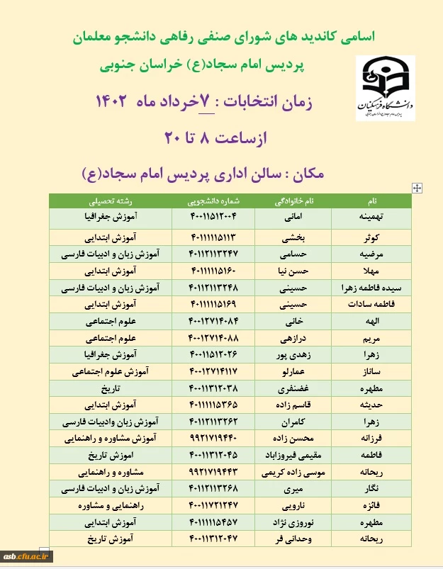 امتیاز دهید : اسامی کاندیدهای شورای صنفی-رفاهی دانشجو معلمان پردیس امام سجاد(ع) 2 شنبه 30 اردیبهشت 1402 ساعت 8:04