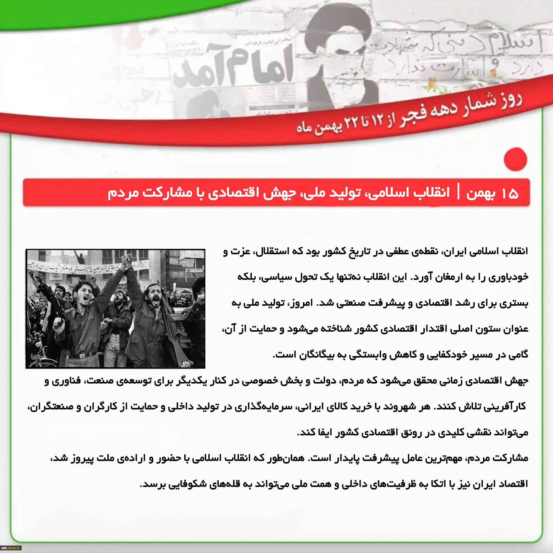 امتیاز دهید : دوشنبه ۱۵ بهمن | انقلاب اسلامی، تولید ملی، جهش اقتصادی با مشارکت مردم 2 دوشنبه 15 بهمن 1403 ساعت 15:16