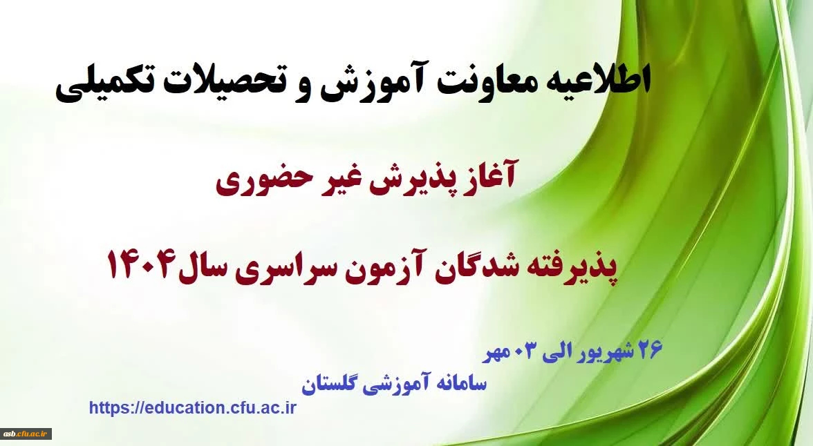 امتیاز دهید : آغاز پذیرش غیر حضوری از پذیرفته شدگان کارشناسی پیوسته سال 1404 دانشگاه فرهنگیان 3 چهارشنبه 26 شهریور 1404 ساعت 21:46
